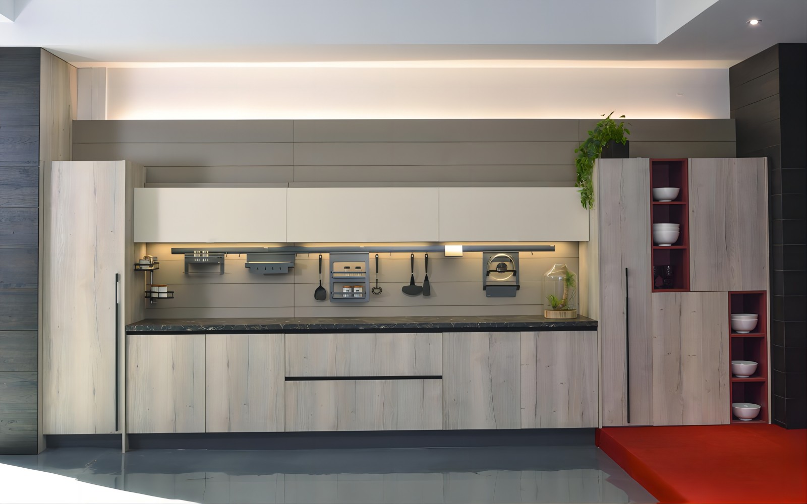 This is a multifunctional shelf system for kitchen or dining room. You can use it as a seasoning shelf also a wine holder after the home bar. An intelligent design makes it a variable looking. It can install with different background like plywood, LED light backboard, stone like PVC board, etc. Slim profile makes your home minimalist. Flexible installation suit for any kind of blank wall size.